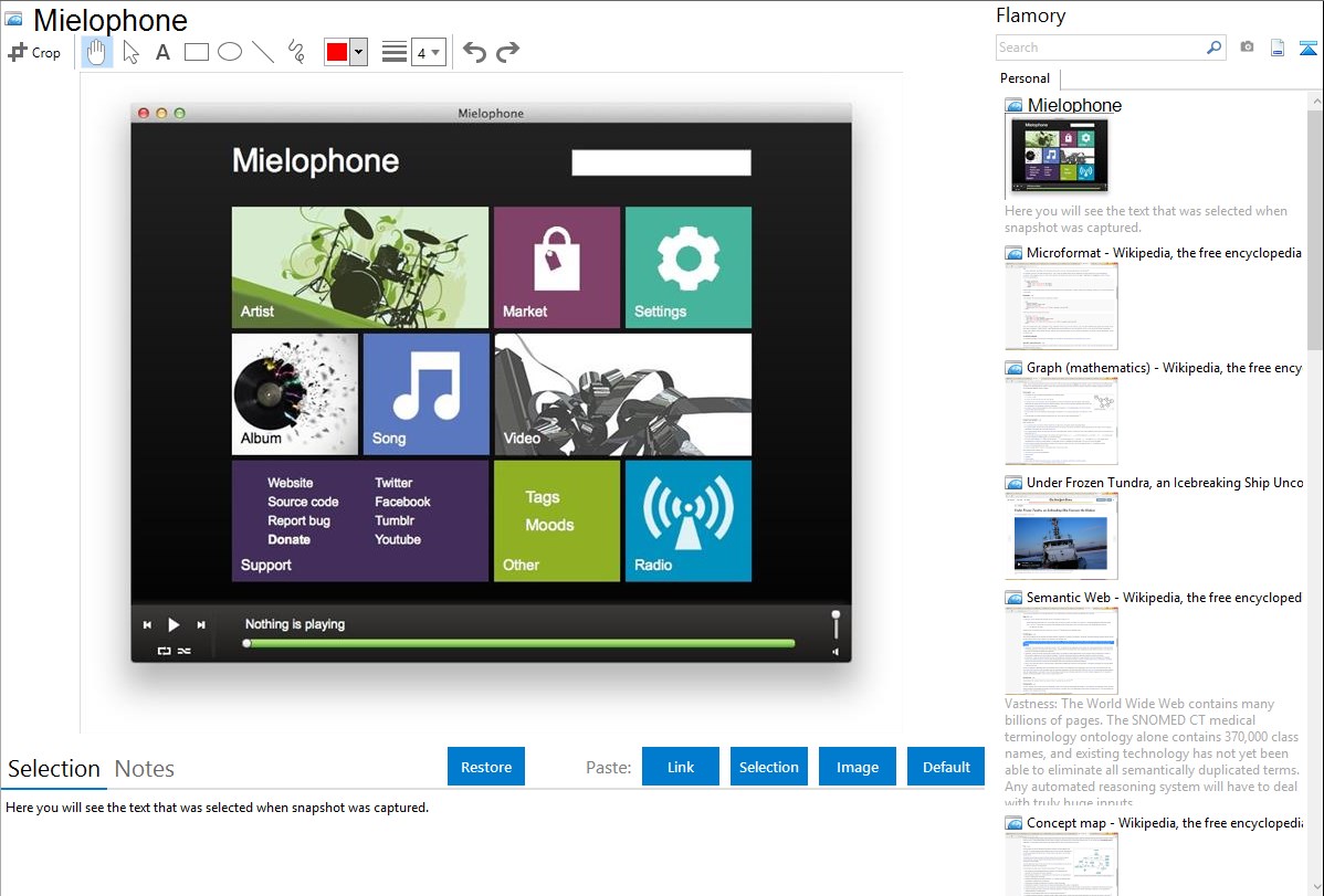 Flamory helps you capture and store screenshots from Mielophone by pressing a single hotkey. It will be saved to a history, so you can continue doing your tasks without interruptions. Later, you can edit the screenshot: crop, resize, add labels and highlights. After that, you can paste the screenshot into any other document or e-mail message.
