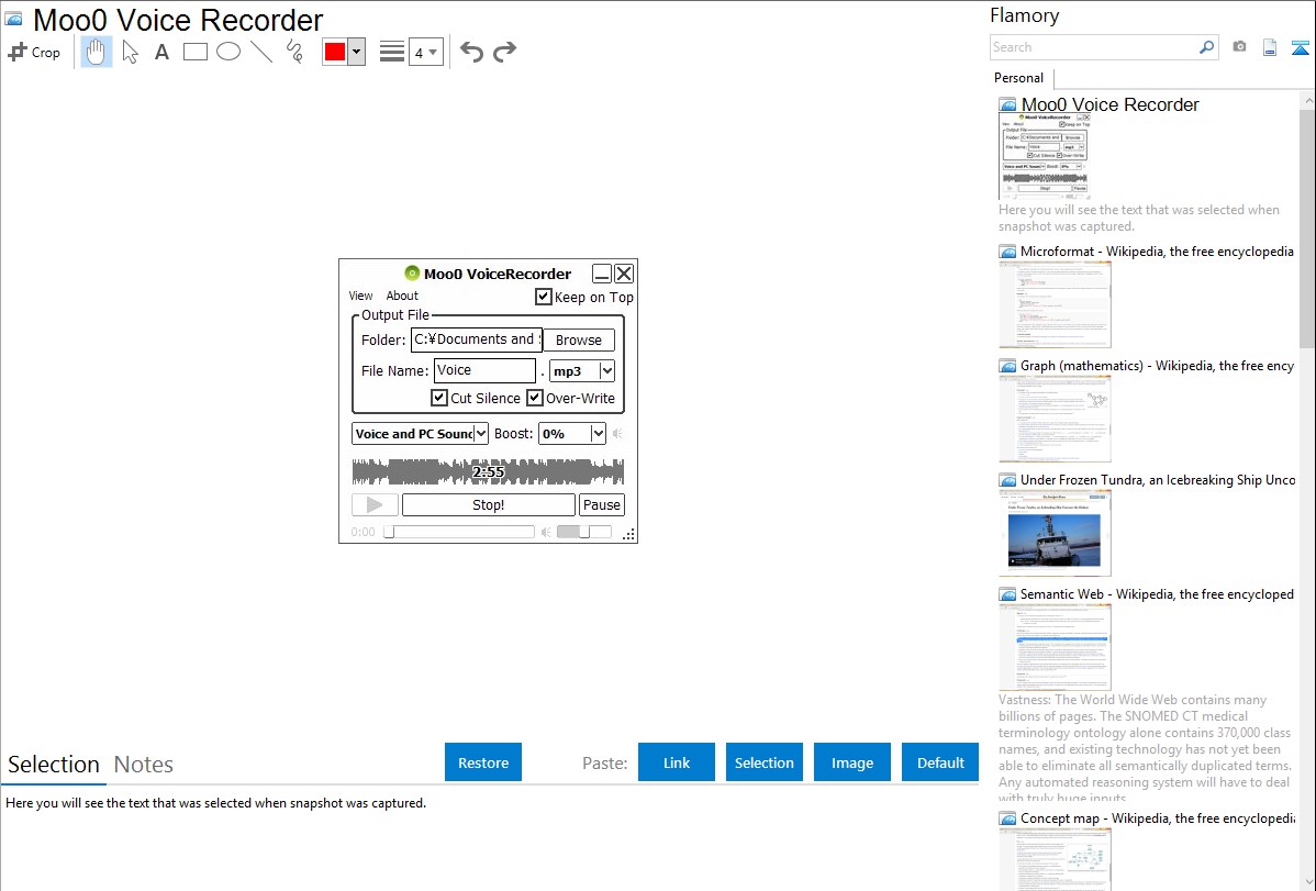 Flamory helps you capture and store screenshots from Moo0 Voice Recorder by pressing a single hotkey. It will be saved to a history, so you can continue doing your tasks without interruptions. Later, you can edit the screenshot: crop, resize, add labels and highlights. After that, you can paste the screenshot into any other document or e-mail message.