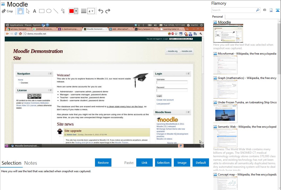 Flamory helps you capture and store screenshots from Moodle by pressing a single hotkey. It will be saved to a history, so you can continue doing your tasks without interruptions. Later, you can edit the screenshot: crop, resize, add labels and highlights. After that, you can paste the screenshot into any other document or e-mail message.