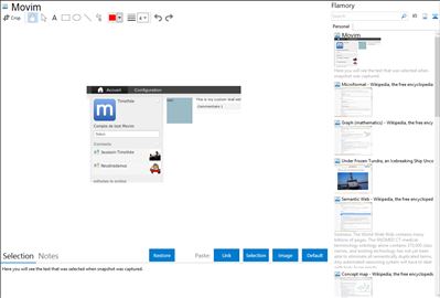 Flamory helps you capture and store screenshots from Movim by pressing a single hotkey. It will be saved to a history, so you can continue doing your tasks without interruptions. Later, you can edit the screenshot: crop, resize, add labels and highlights. After that, you can paste the screenshot into any other document or e-mail message.