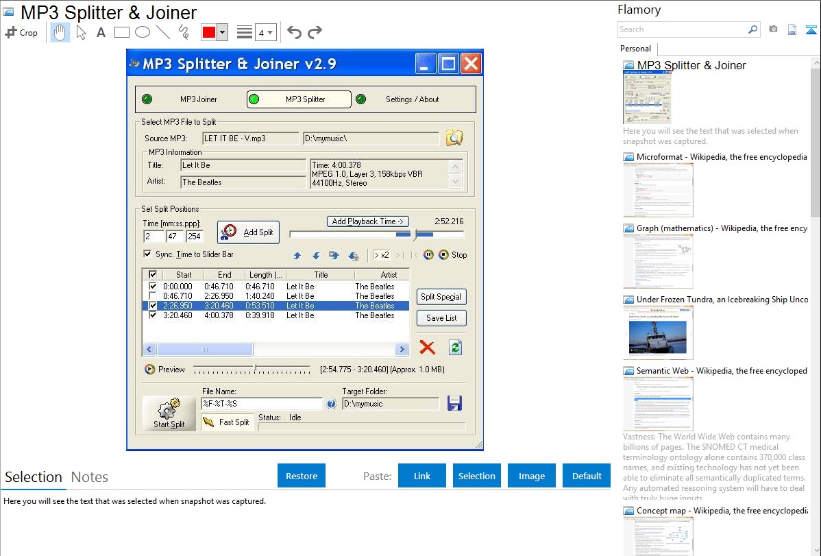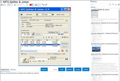 Flamory provides advanced bookmarking for MP3 Splitter & Joiner. It captures screen, selection, text of the document and other context. You can find this bookmark later using search by document content or looking through thumbnail list.