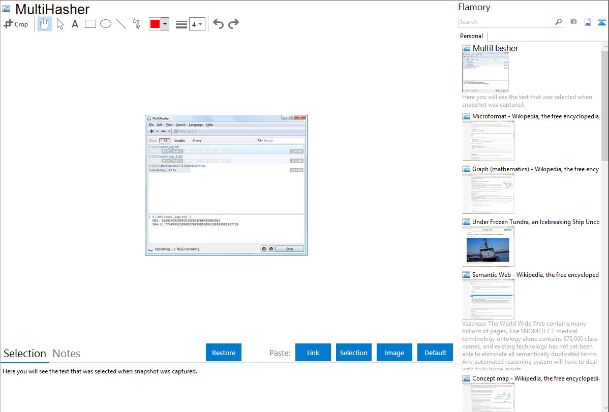 Flamory helps you capture and store screenshots from MultiHasher by pressing a single hotkey. It will be saved to a history, so you can continue doing your tasks without interruptions. Later, you can edit the screenshot: crop, resize, add labels and highlights. After that, you can paste the screenshot into any other document or e-mail message.