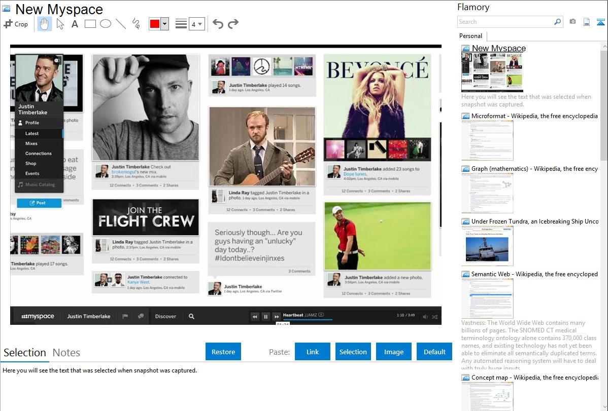 Flamory helps you capture and store screenshots from New Myspace by pressing a single hotkey. It will be saved to a history, so you can continue doing your tasks without interruptions. Later, you can edit the screenshot: crop, resize, add labels and highlights. After that, you can paste the screenshot into any other document or e-mail message.