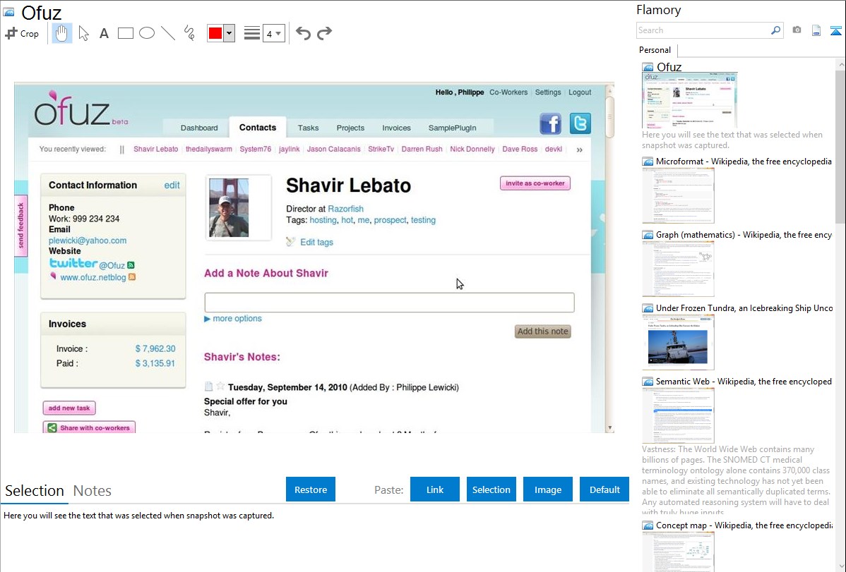 Flamory helps you capture and store screenshots from Ofuz by pressing a single hotkey. It will be saved to a history, so you can continue doing your tasks without interruptions. Later, you can edit the screenshot: crop, resize, add labels and highlights. After that, you can paste the screenshot into any other document or e-mail message.