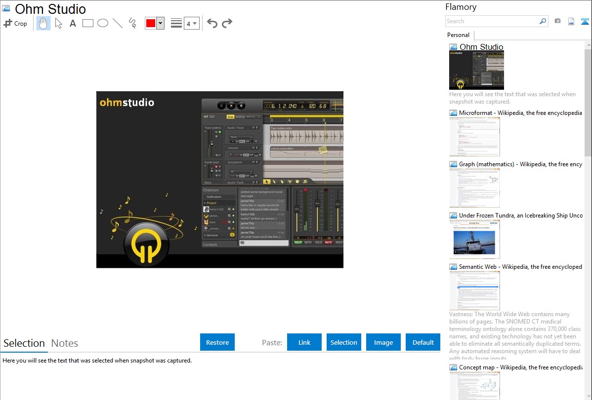 Flamory helps you capture and store screenshots from Ohm Studio by pressing a single hotkey. It will be saved to a history, so you can continue doing your tasks without interruptions. Later, you can edit the screenshot: crop, resize, add labels and highlights. After that, you can paste the screenshot into any other document or e-mail message.