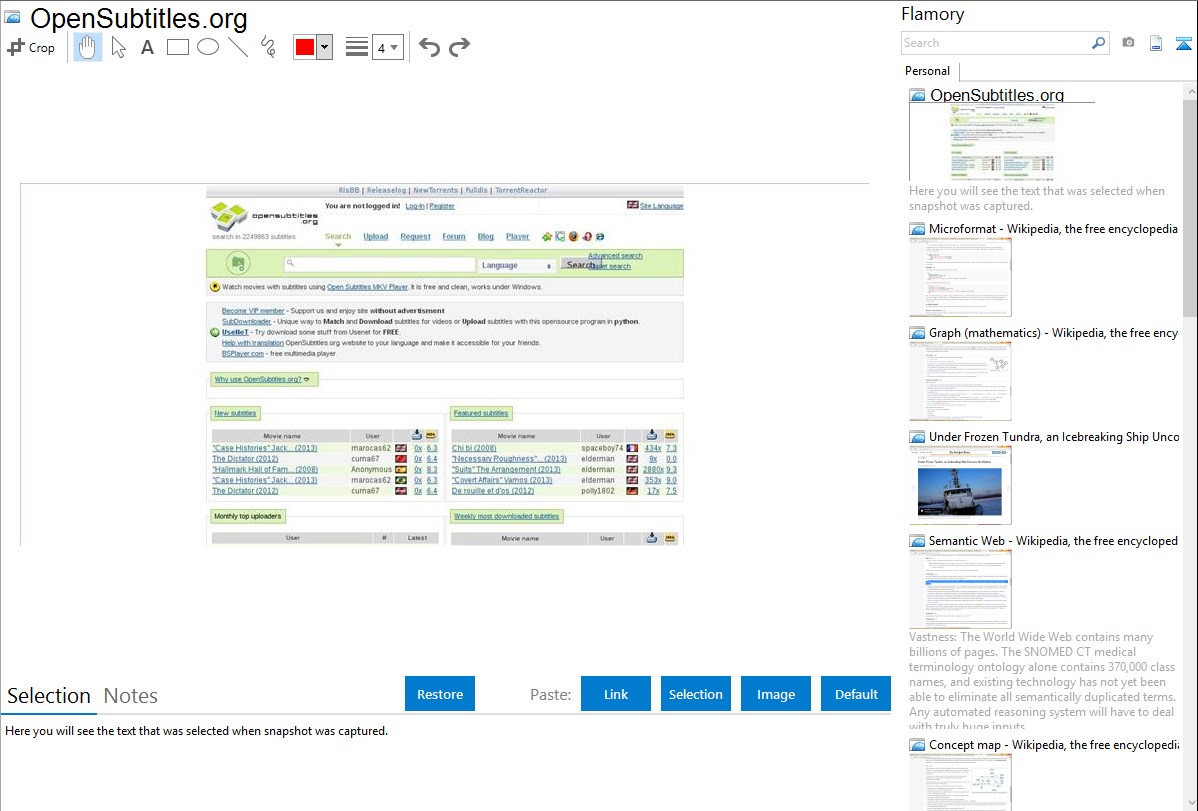 Flamory helps you capture and store screenshots from OpenSubtitles.org by pressing a single hotkey. It will be saved to a history, so you can continue doing your tasks without interruptions. Later, you can edit the screenshot: crop, resize, add labels and highlights. After that, you can paste the screenshot into any other document or e-mail message.