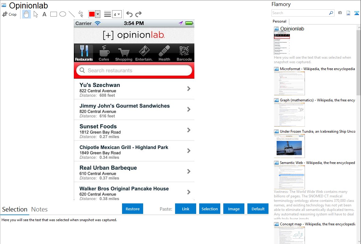 Flamory helps you capture and store screenshots from Opinionlab by pressing a single hotkey. It will be saved to a history, so you can continue doing your tasks without interruptions. Later, you can edit the screenshot: crop, resize, add labels and highlights. After that, you can paste the screenshot into any other document or e-mail message.