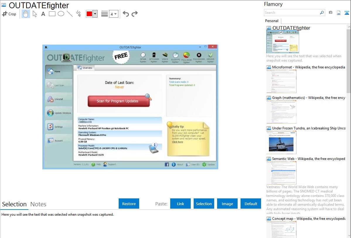 Flamory helps you capture and store screenshots from OUTDATEfighter by pressing a single hotkey. It will be saved to a history, so you can continue doing your tasks without interruptions. Later, you can edit the screenshot: crop, resize, add labels and highlights. After that, you can paste the screenshot into any other document or e-mail message.