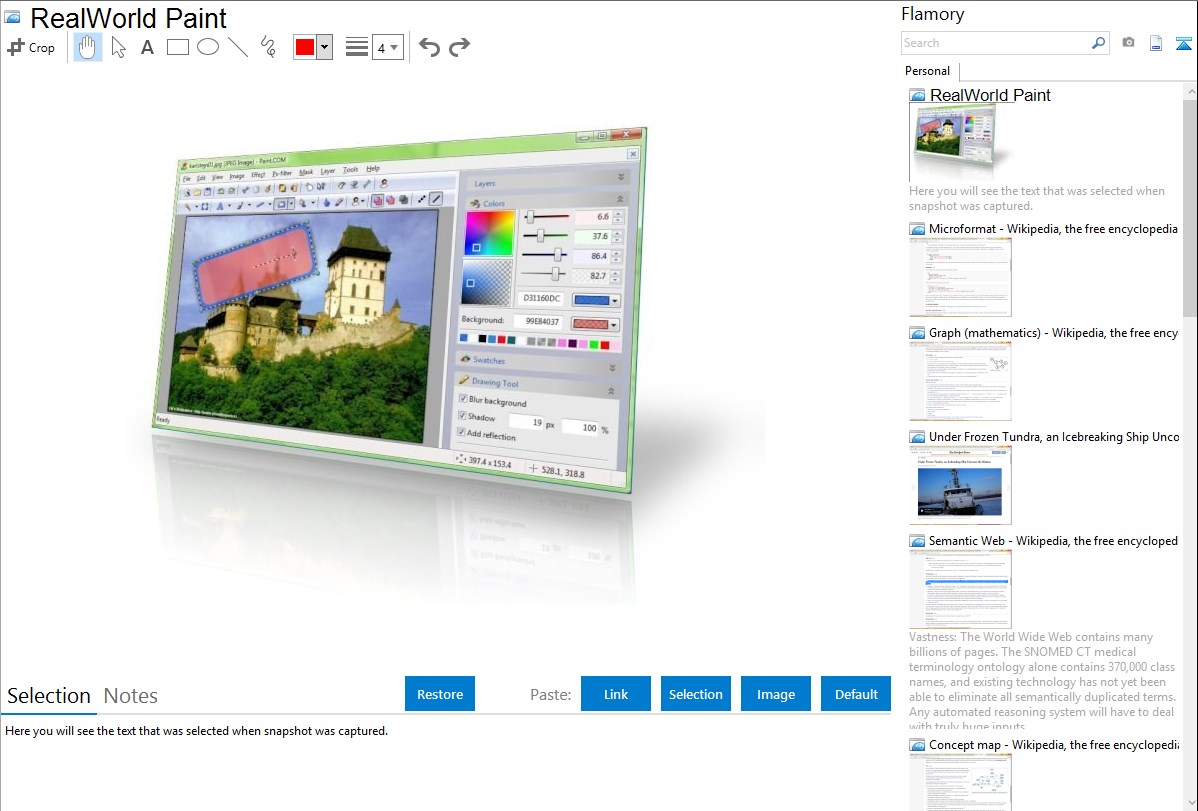 Flamory helps you capture and store screenshots from RealWorld Paint by pressing a single hotkey. It will be saved to a history, so you can continue doing your tasks without interruptions. Later, you can edit the screenshot: crop, resize, add labels and highlights. After that, you can paste the screenshot into any other document or e-mail message.
