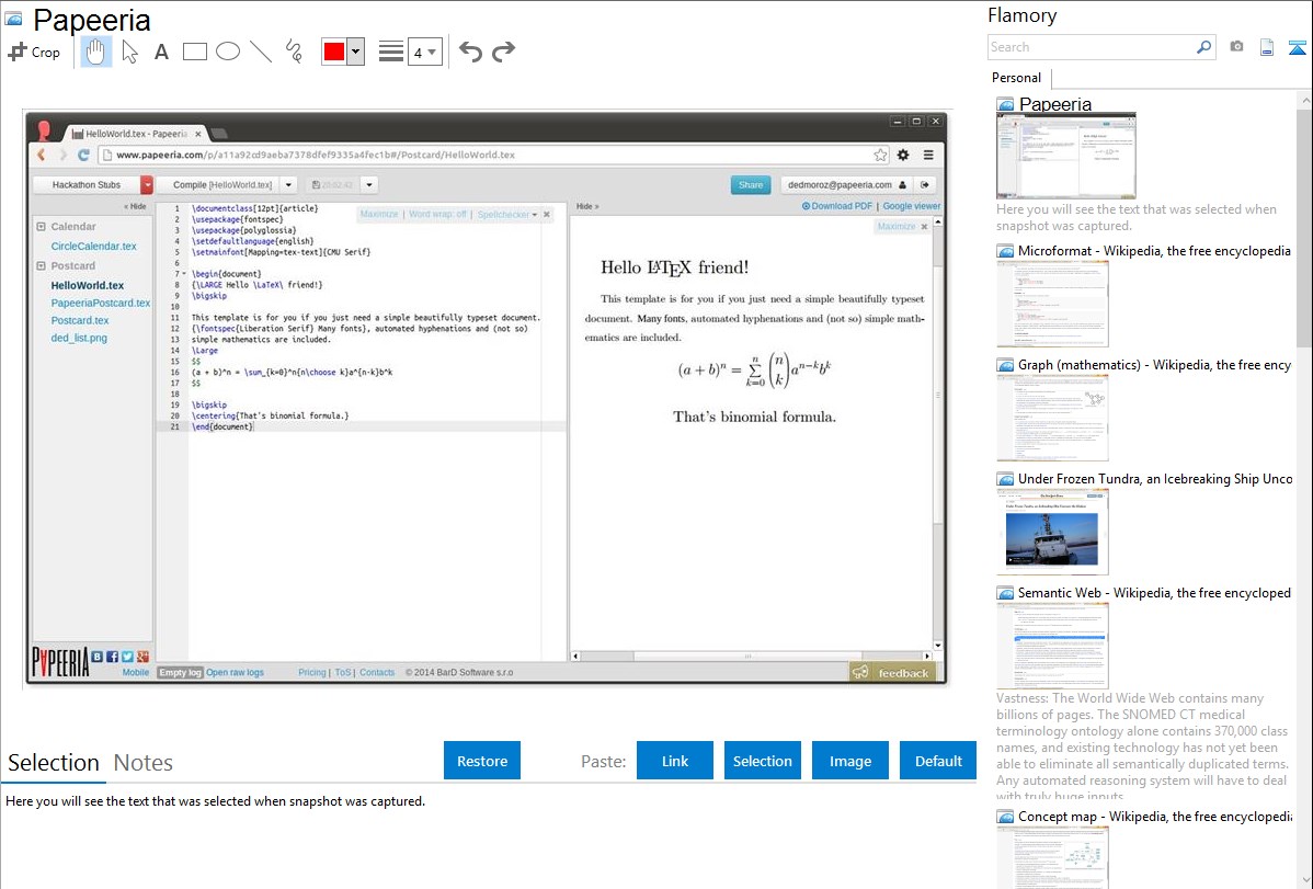 Flamory provides advanced bookmarking for Papeeria. It captures screen, selection, text on the page and other context. You can find this bookmark later using search by page content or looking through thumbnail list.