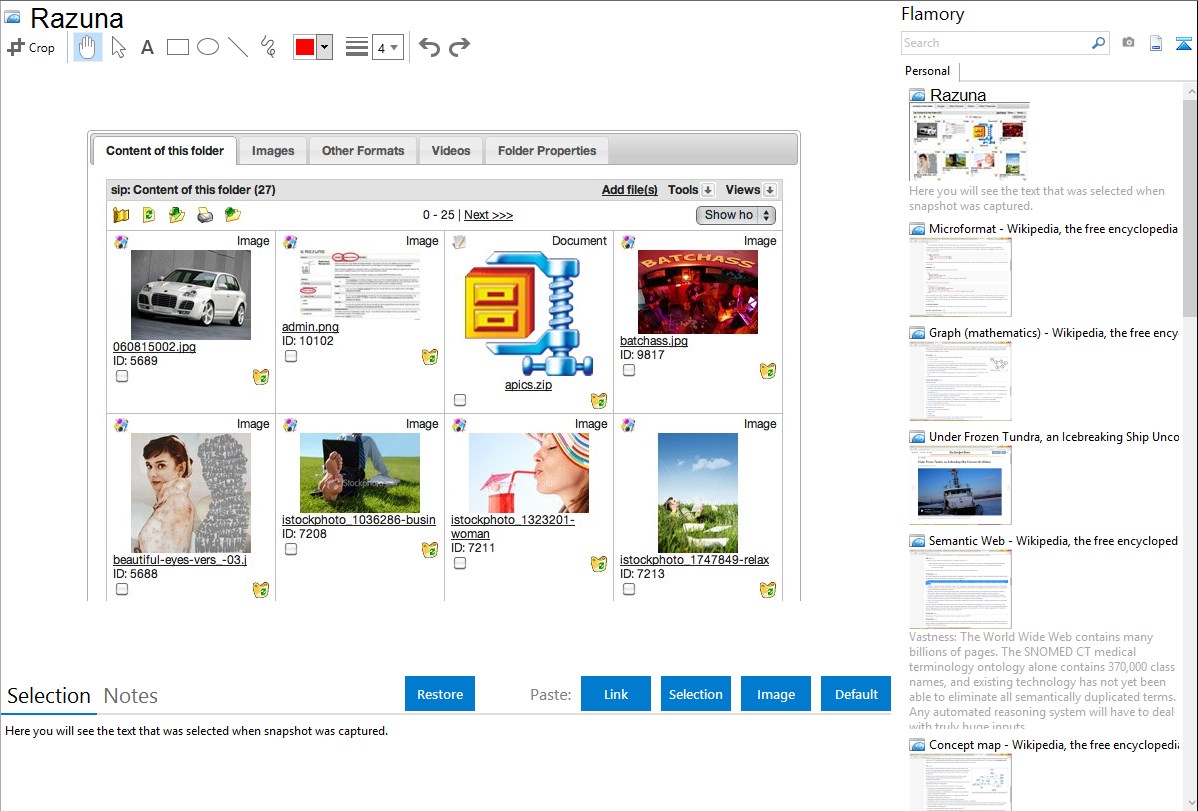 Flamory helps you capture and store screenshots from Razuna by pressing a single hotkey. It will be saved to a history, so you can continue doing your tasks without interruptions. Later, you can edit the screenshot: crop, resize, add labels and highlights. After that, you can paste the screenshot into any other document or e-mail message.