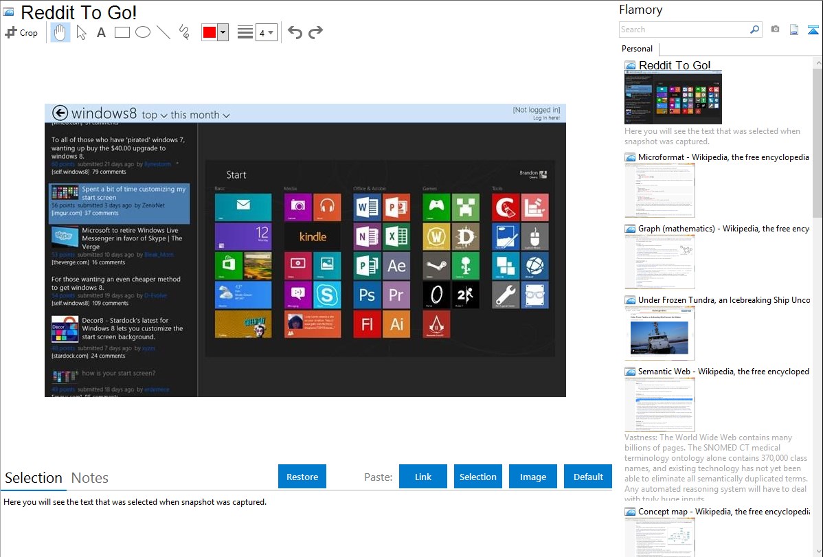 Flamory helps you capture and store screenshots from Reddit To Go! by pressing a single hotkey. It will be saved to a history, so you can continue doing your tasks without interruptions. Later, you can edit the screenshot: crop, resize, add labels and highlights. After that, you can paste the screenshot into any other document or e-mail message.