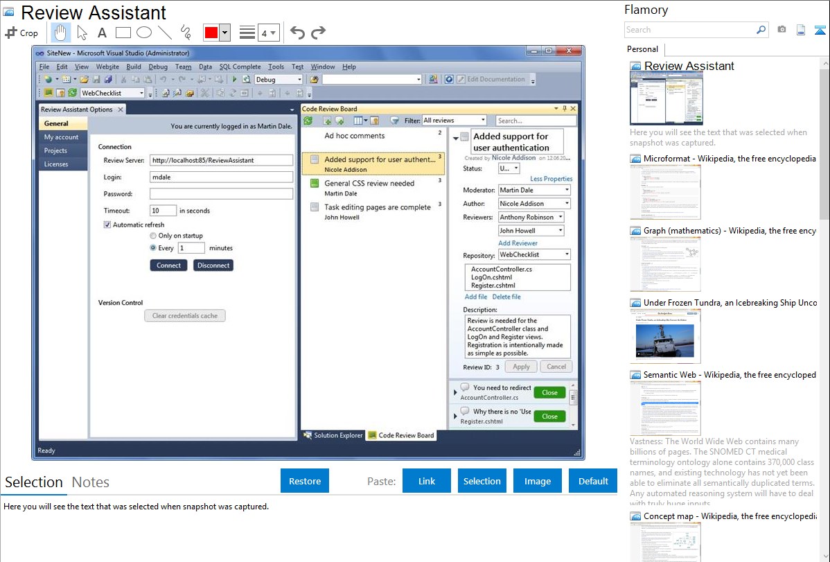 Flamory helps you capture and store screenshots from Review Assistant by pressing a single hotkey. It will be saved to a history, so you can continue doing your tasks without interruptions. Later, you can edit the screenshot: crop, resize, add labels and highlights. After that, you can paste the screenshot into any other document or e-mail message.