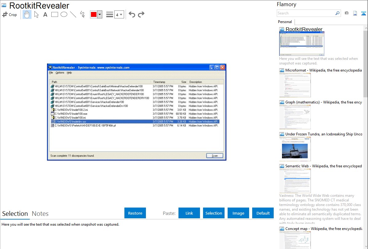 Flamory helps you capture and store screenshots from RootkitRevealer by pressing a single hotkey. It will be saved to a history, so you can continue doing your tasks without interruptions. Later, you can edit the screenshot: crop, resize, add labels and highlights. After that, you can paste the screenshot into any other document or e-mail message.