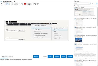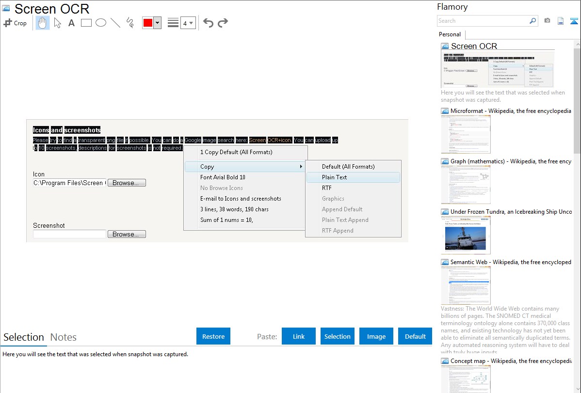 Flamory helps you capture and store screenshots from Screen OCR by pressing a single hotkey. It will be saved to a history, so you can continue doing your tasks without interruptions. Later, you can edit the screenshot: crop, resize, add labels and highlights. After that, you can paste the screenshot into any other document or e-mail message.