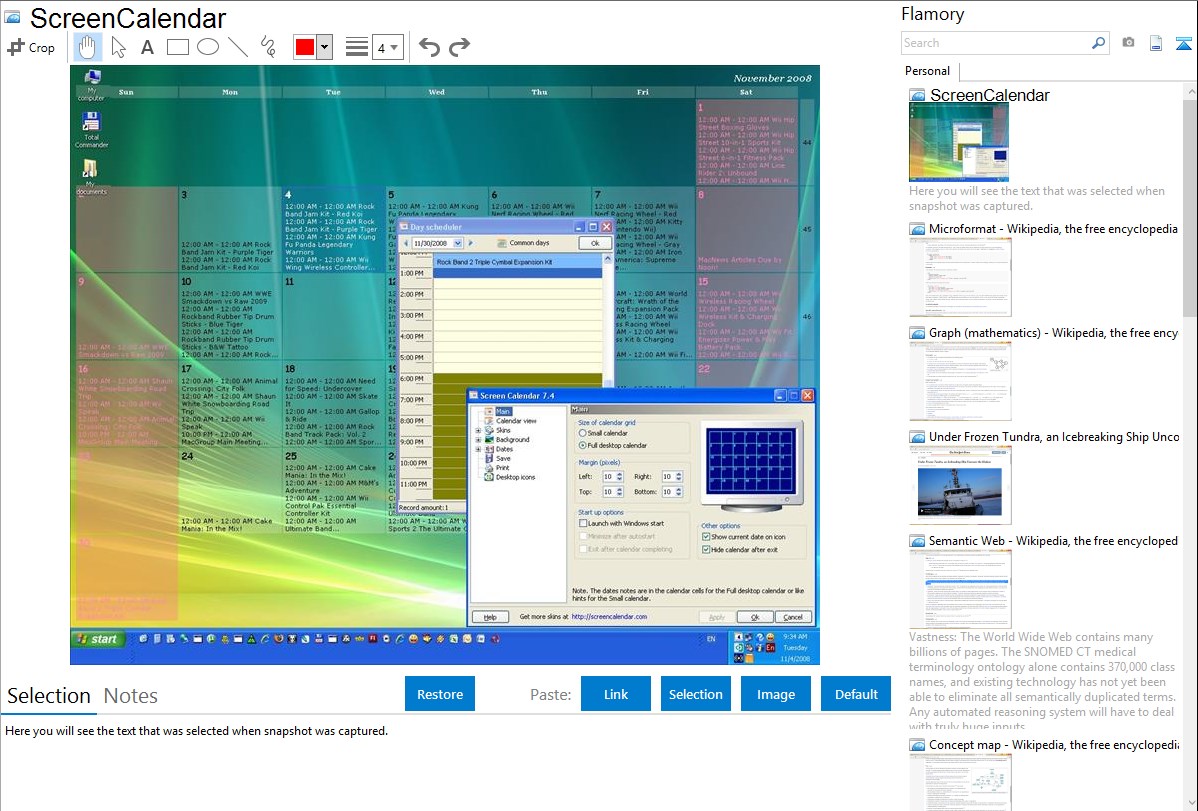 Flamory helps you capture and store screenshots from ScreenCalendar by pressing a single hotkey. It will be saved to a history, so you can continue doing your tasks without interruptions. Later, you can edit the screenshot: crop, resize, add labels and highlights. After that, you can paste the screenshot into any other document or e-mail message.