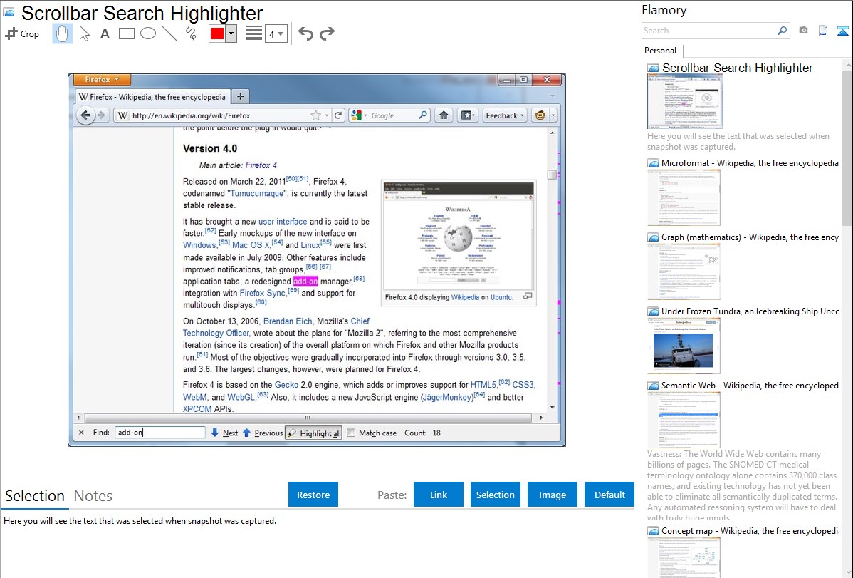Flamory helps you capture and store screenshots from Scrollbar Search Highlighter by pressing a single hotkey. It will be saved to a history, so you can continue doing your tasks without interruptions. Later, you can edit the screenshot: crop, resize, add labels and highlights. After that, you can paste the screenshot into any other document or e-mail message.