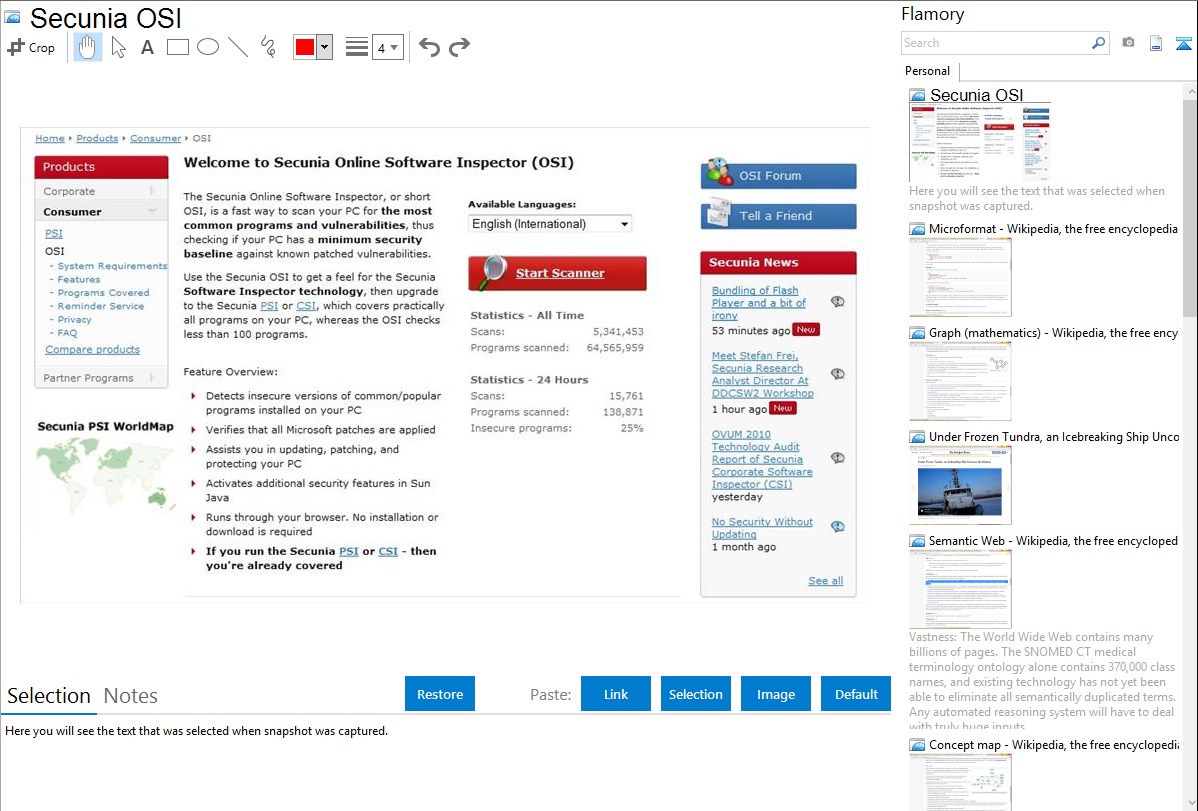 Flamory helps you capture and store screenshots from Secunia OSI by pressing a single hotkey. It will be saved to a history, so you can continue doing your tasks without interruptions. Later, you can edit the screenshot: crop, resize, add labels and highlights. After that, you can paste the screenshot into any other document or e-mail message.