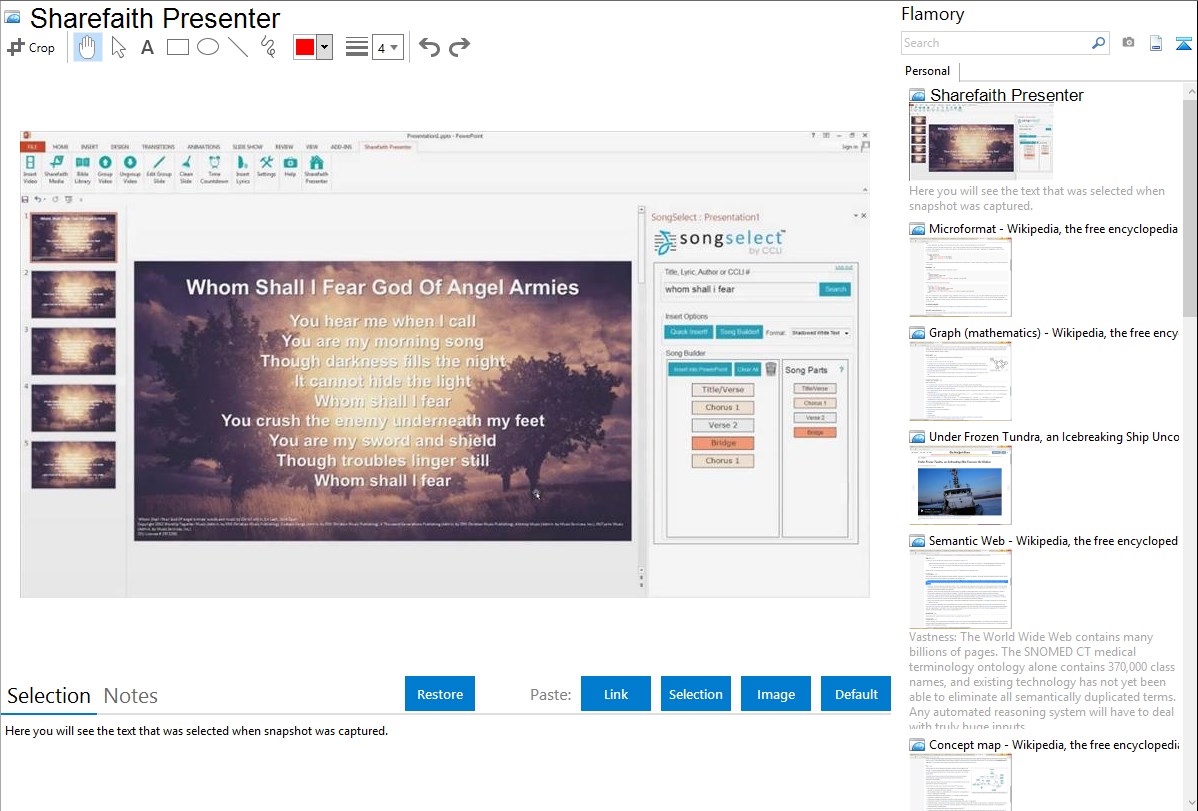 Flamory helps you capture and store screenshots from Sharefaith Presenter by pressing a single hotkey. It will be saved to a history, so you can continue doing your tasks without interruptions. Later, you can edit the screenshot: crop, resize, add labels and highlights. After that, you can paste the screenshot into any other document or e-mail message.