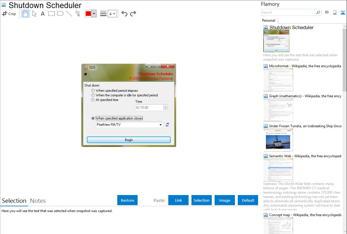 Flamory helps you capture and store screenshots from Shutdown Scheduler by pressing a single hotkey. It will be saved to a history, so you can continue doing your tasks without interruptions. Later, you can edit the screenshot: crop, resize, add labels and highlights. After that, you can paste the screenshot into any other document or e-mail message.