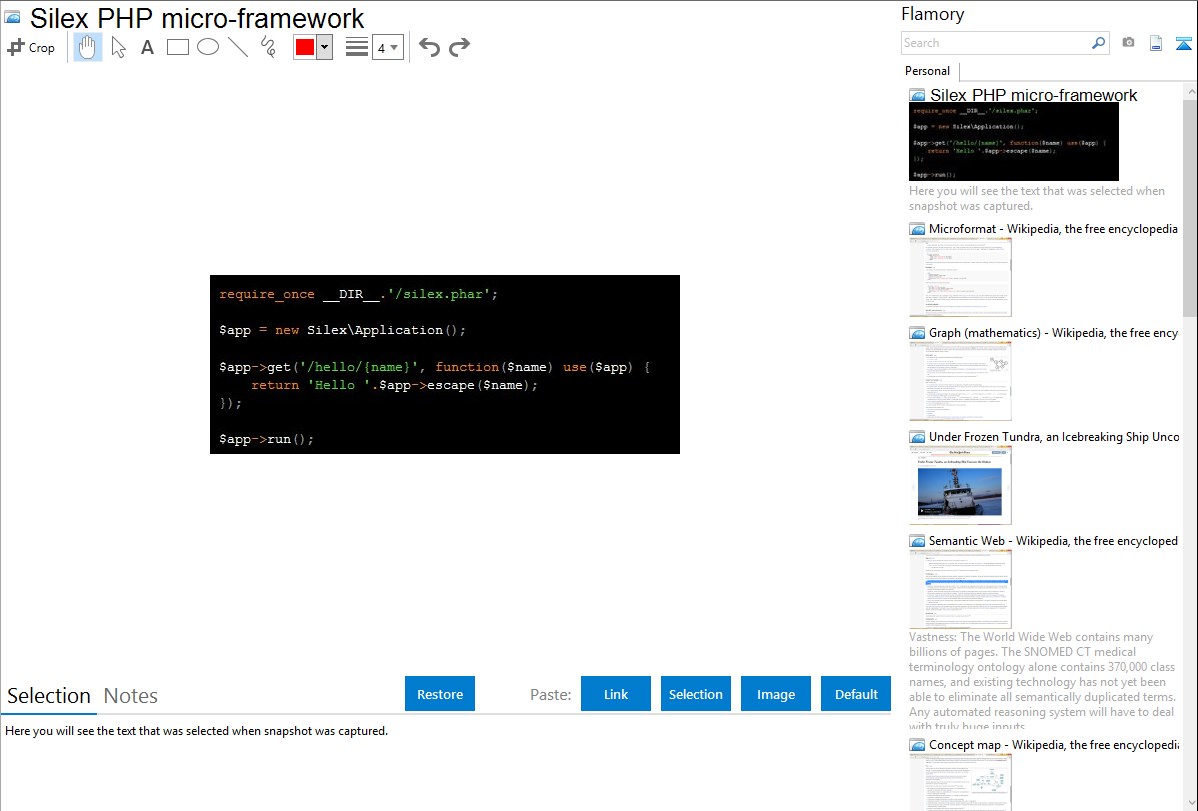 Flamory helps you capture and store screenshots from Silex PHP micro-framework by pressing a single hotkey. It will be saved to a history, so you can continue doing your tasks without interruptions. Later, you can edit the screenshot: crop, resize, add labels and highlights. After that, you can paste the screenshot into any other document or e-mail message.
