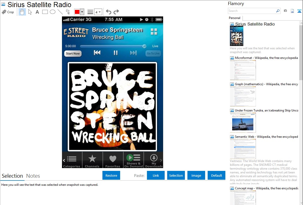 Flamory helps you capture and store screenshots from Sirius Satellite Radio by pressing a single hotkey. It will be saved to a history, so you can continue doing your tasks without interruptions. Later, you can edit the screenshot: crop, resize, add labels and highlights. After that, you can paste the screenshot into any other document or e-mail message.