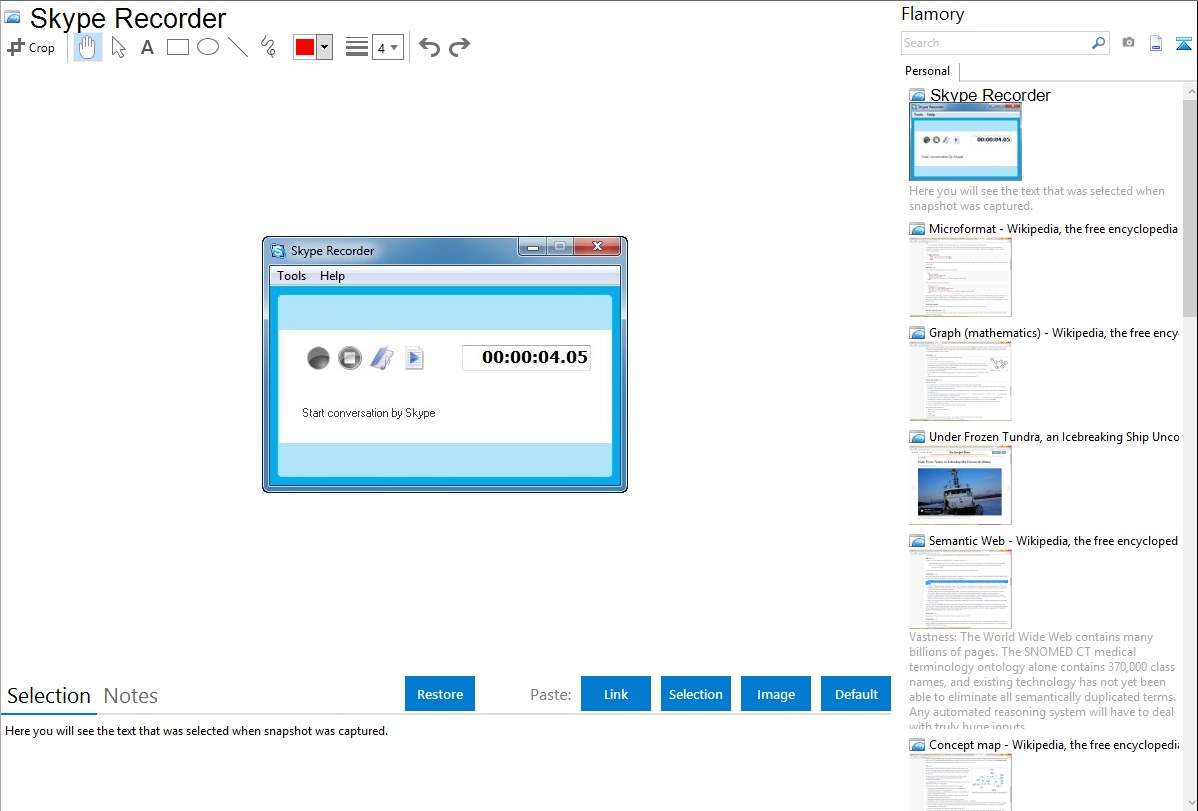 Flamory helps you capture and store screenshots from Skype Recorder by pressing a single hotkey. It will be saved to a history, so you can continue doing your tasks without interruptions. Later, you can edit the screenshot: crop, resize, add labels and highlights. After that, you can paste the screenshot into any other document or e-mail message.