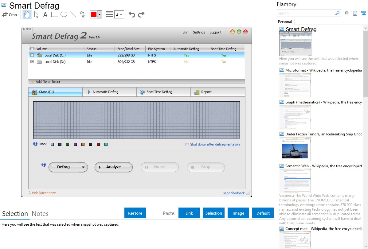 Flamory helps you capture and store screenshots from Smart Defrag by pressing a single hotkey. It will be saved to a history, so you can continue doing your tasks without interruptions. Later, you can edit the screenshot: crop, resize, add labels and highlights. After that, you can paste the screenshot into any other document or e-mail message.