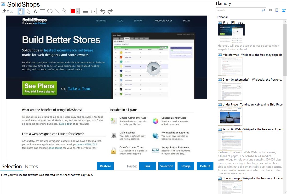 Flamory provides advanced bookmarking for SolidShops. It captures screen, selection, text on the page and other context. You can find this bookmark later using search by page content or looking through thumbnail list.