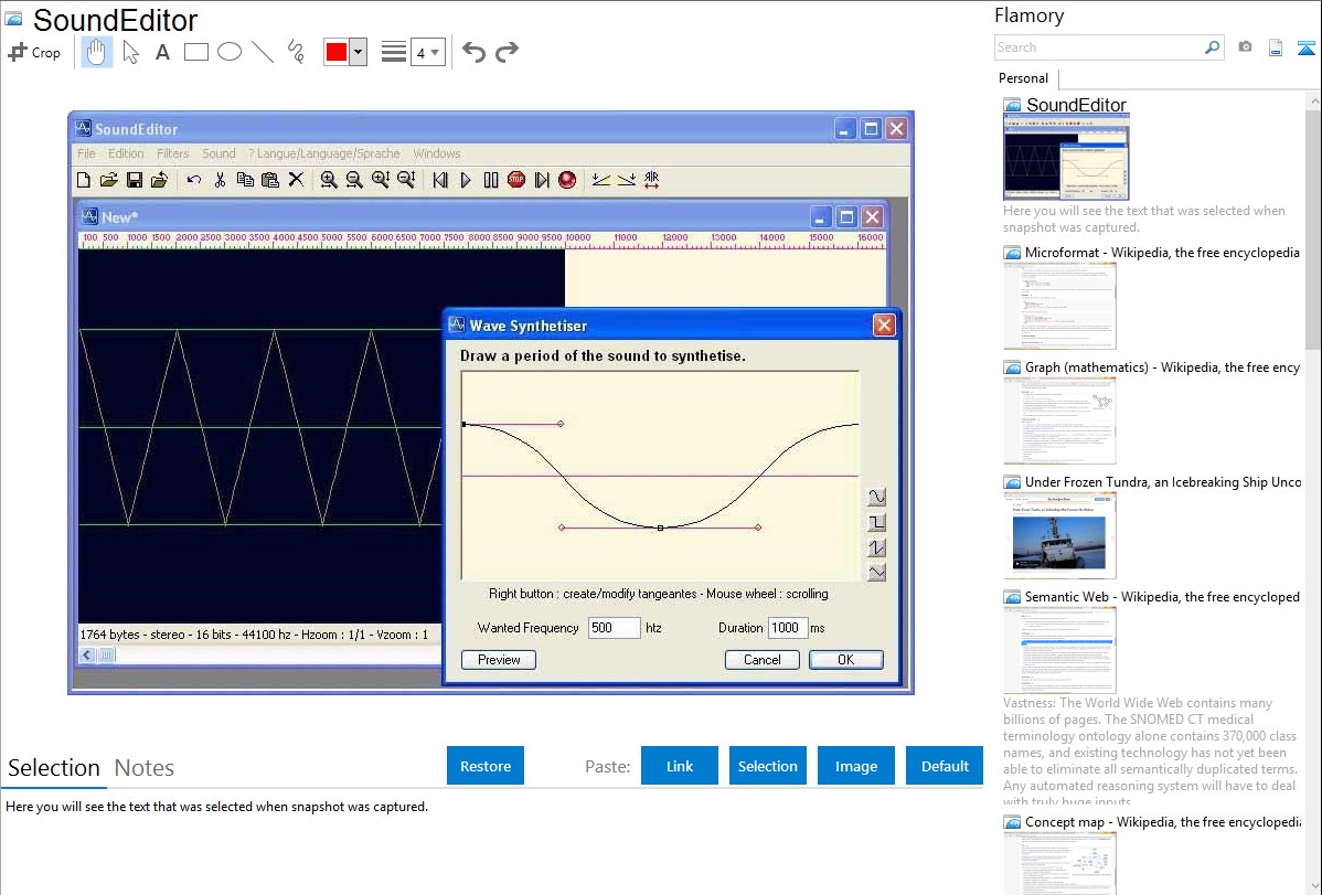 Flamory provides advanced bookmarking for SoundEditor. It captures screen, selection, text of the document and other context. You can find this bookmark later using search by document content or looking through thumbnail list.
