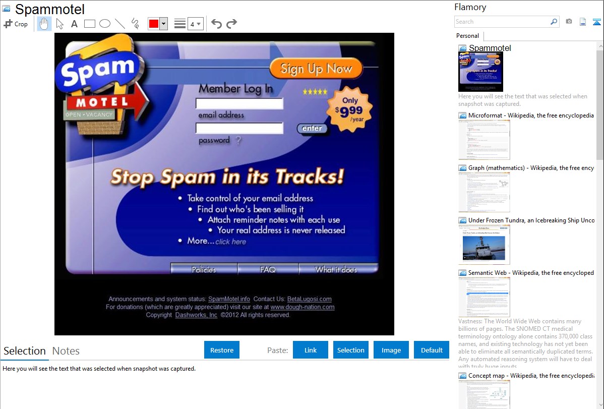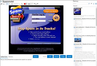 Flamory helps you capture and store screenshots from Spammotel by pressing a single hotkey. It will be saved to a history, so you can continue doing your tasks without interruptions. Later, you can edit the screenshot: crop, resize, add labels and highlights. After that, you can paste the screenshot into any other document or e-mail message.