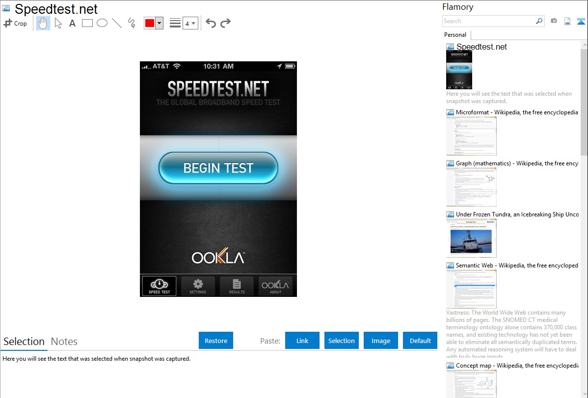 Flamory helps you capture and store screenshots from Speedtest.net by pressing a single hotkey. It will be saved to a history, so you can continue doing your tasks without interruptions. Later, you can edit the screenshot: crop, resize, add labels and highlights. After that, you can paste the screenshot into any other document or e-mail message.