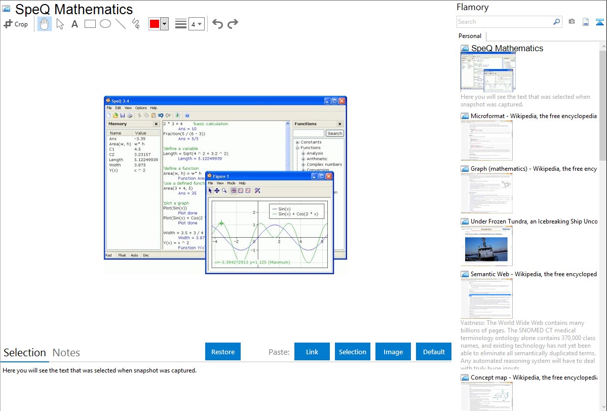 Flamory helps you capture and store screenshots from SpeQ Mathematics by pressing a single hotkey. It will be saved to a history, so you can continue doing your tasks without interruptions. Later, you can edit the screenshot: crop, resize, add labels and highlights. After that, you can paste the screenshot into any other document or e-mail message.
