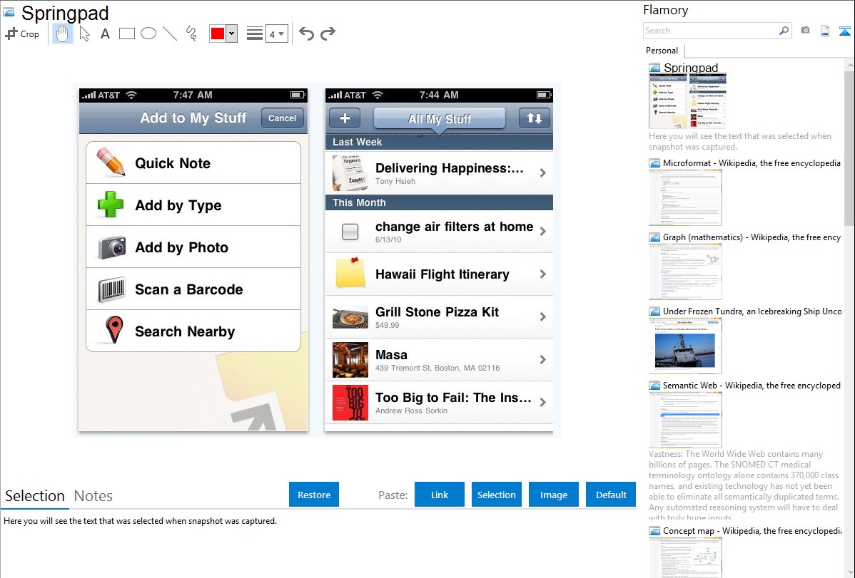 Flamory helps you capture and store screenshots from Springpad by pressing a single hotkey. It will be saved to a history, so you can continue doing your tasks without interruptions. Later, you can edit the screenshot: crop, resize, add labels and highlights. After that, you can paste the screenshot into any other document or e-mail message.