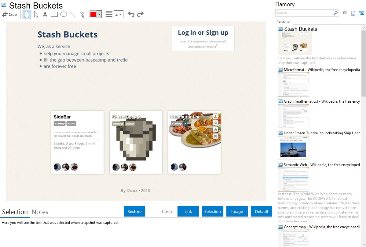 Flamory helps you capture and store screenshots from Stash Buckets by pressing a single hotkey. It will be saved to a history, so you can continue doing your tasks without interruptions. Later, you can edit the screenshot: crop, resize, add labels and highlights. After that, you can paste the screenshot into any other document or e-mail message.