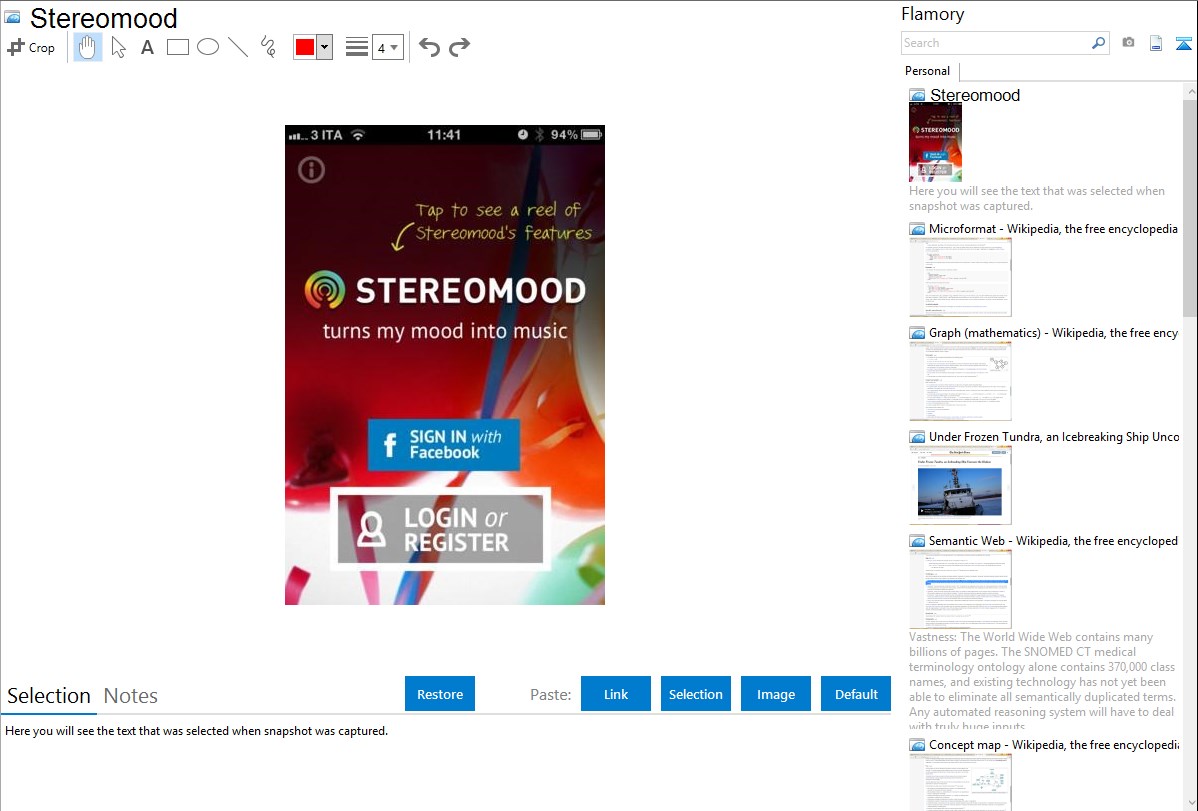 Flamory helps you capture and store screenshots from Stereomood by pressing a single hotkey. It will be saved to a history, so you can continue doing your tasks without interruptions. Later, you can edit the screenshot: crop, resize, add labels and highlights. After that, you can paste the screenshot into any other document or e-mail message.