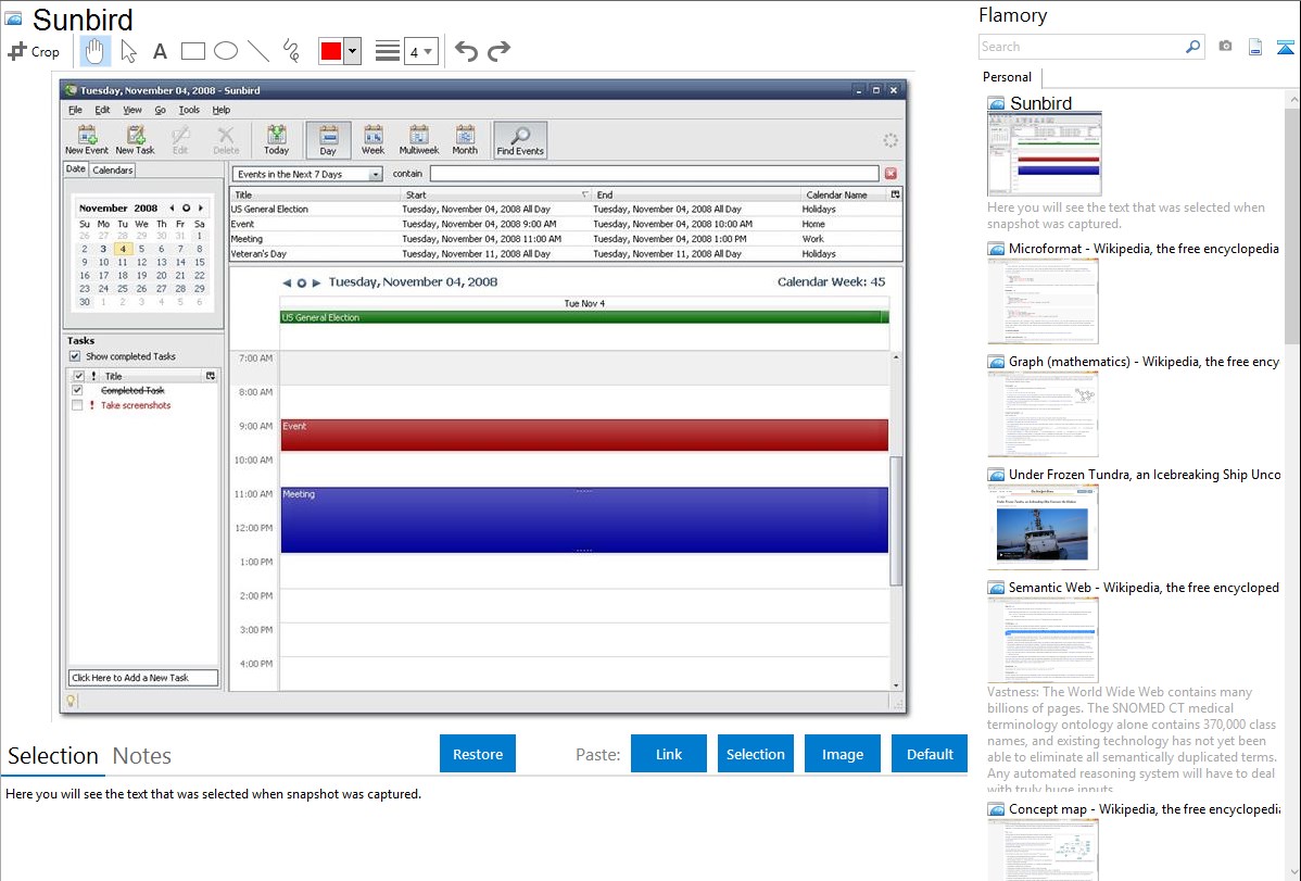 Flamory helps you capture and store screenshots from Sunbird by pressing a single hotkey. It will be saved to a history, so you can continue doing your tasks without interruptions. Later, you can edit the screenshot: crop, resize, add labels and highlights. After that, you can paste the screenshot into any other document or e-mail message.