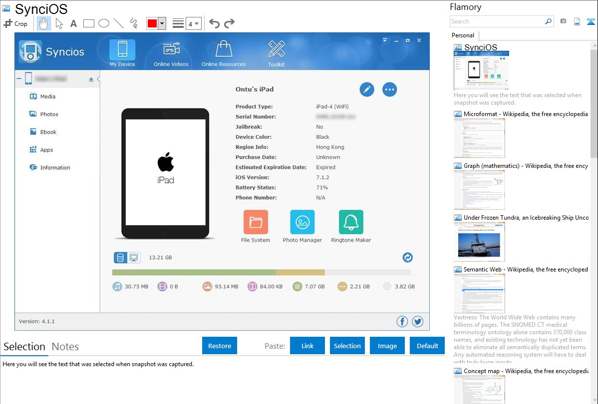 Flamory helps you capture and store screenshots from SynciOS by pressing a single hotkey. It will be saved to a history, so you can continue doing your tasks without interruptions. Later, you can edit the screenshot: crop, resize, add labels and highlights. After that, you can paste the screenshot into any other document or e-mail message.