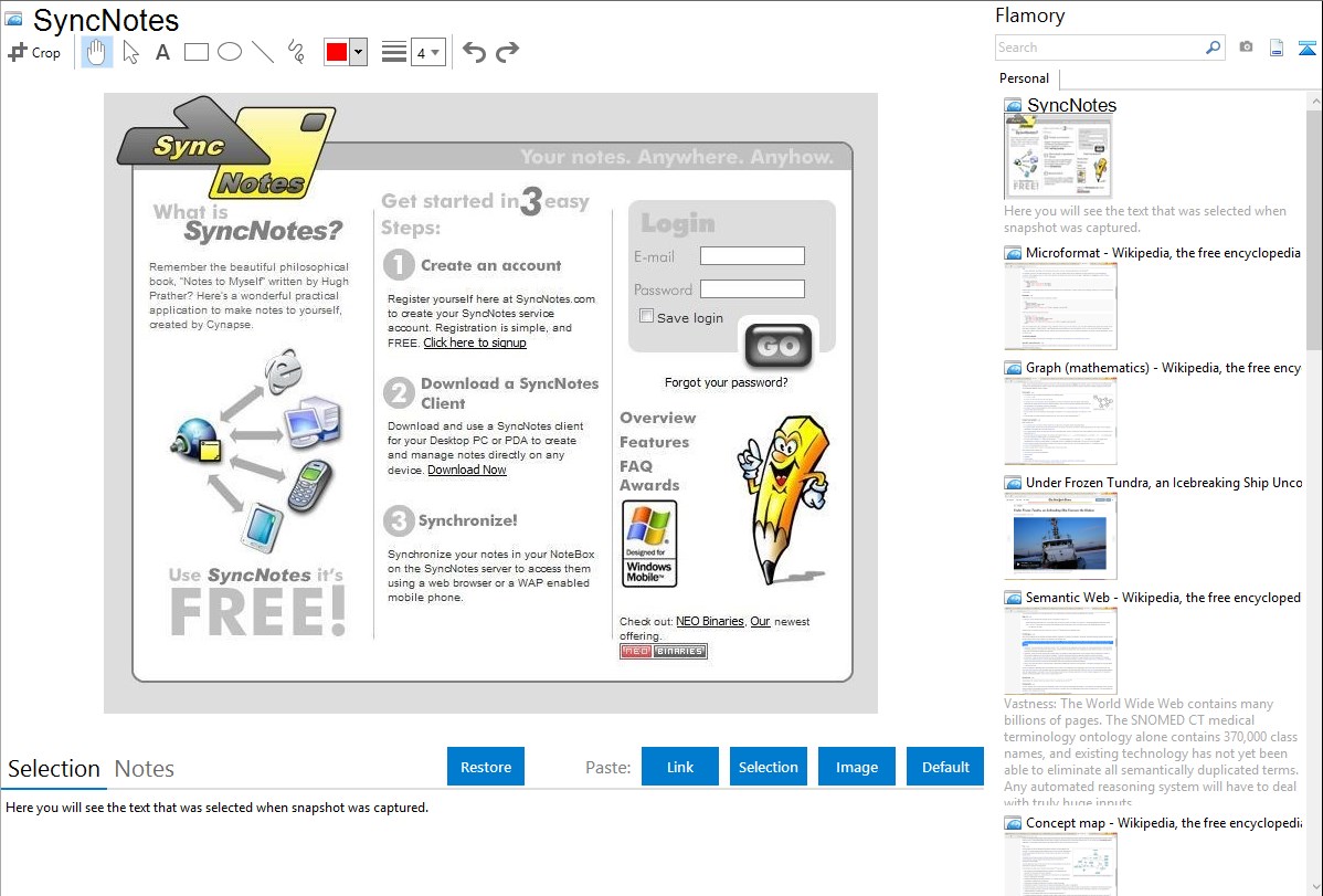 Flamory helps you capture and store screenshots from SyncNotes by pressing a single hotkey. It will be saved to a history, so you can continue doing your tasks without interruptions. Later, you can edit the screenshot: crop, resize, add labels and highlights. After that, you can paste the screenshot into any other document or e-mail message.