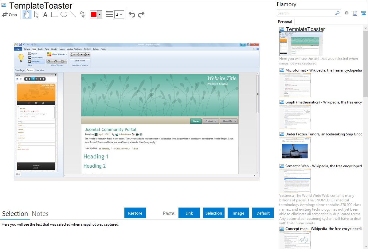 Flamory helps you capture and store screenshots from TemplateToaster by pressing a single hotkey. It will be saved to a history, so you can continue doing your tasks without interruptions. Later, you can edit the screenshot: crop, resize, add labels and highlights. After that, you can paste the screenshot into any other document or e-mail message.