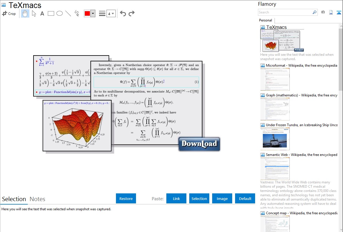 Flamory helps you capture and store screenshots from TeXmacs by pressing a single hotkey. It will be saved to a history, so you can continue doing your tasks without interruptions. Later, you can edit the screenshot: crop, resize, add labels and highlights. After that, you can paste the screenshot into any other document or e-mail message.