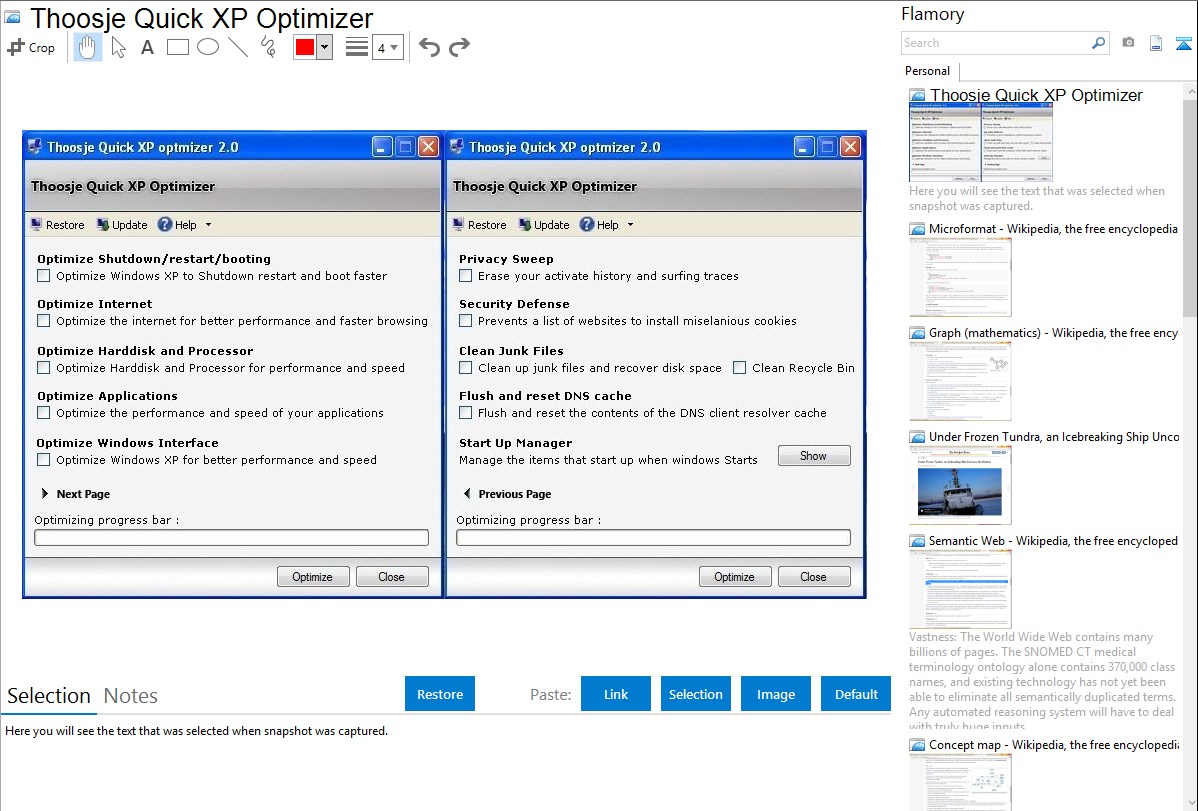 Flamory helps you capture and store screenshots from Thoosje Quick XP Optimizer by pressing a single hotkey. It will be saved to a history, so you can continue doing your tasks without interruptions. Later, you can edit the screenshot: crop, resize, add labels and highlights. After that, you can paste the screenshot into any other document or e-mail message.