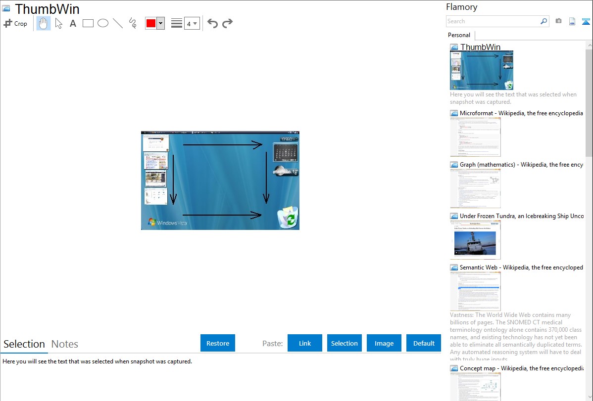 Flamory helps you capture and store screenshots from ThumbWin by pressing a single hotkey. It will be saved to a history, so you can continue doing your tasks without interruptions. Later, you can edit the screenshot: crop, resize, add labels and highlights. After that, you can paste the screenshot into any other document or e-mail message.