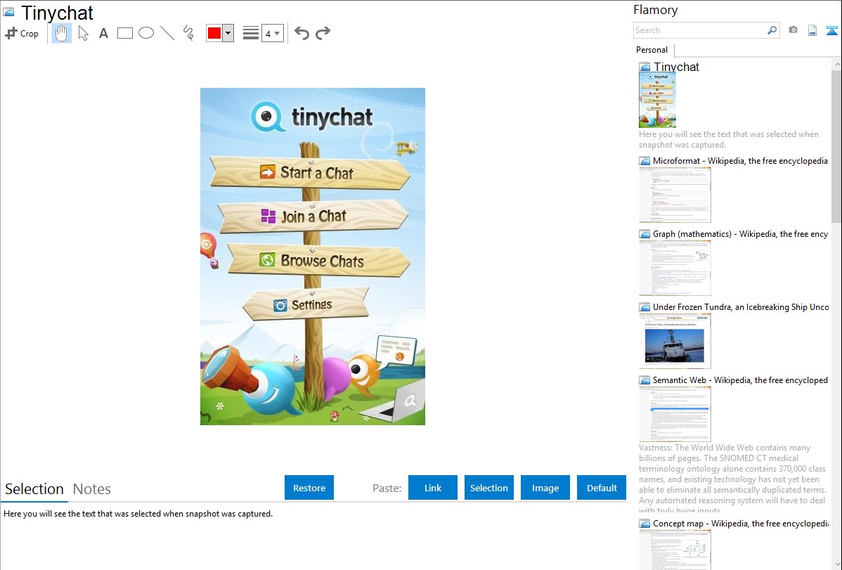 Flamory helps you capture and store screenshots from Tinychat by pressing a single hotkey. It will be saved to a history, so you can continue doing your tasks without interruptions. Later, you can edit the screenshot: crop, resize, add labels and highlights. After that, you can paste the screenshot into any other document or e-mail message.