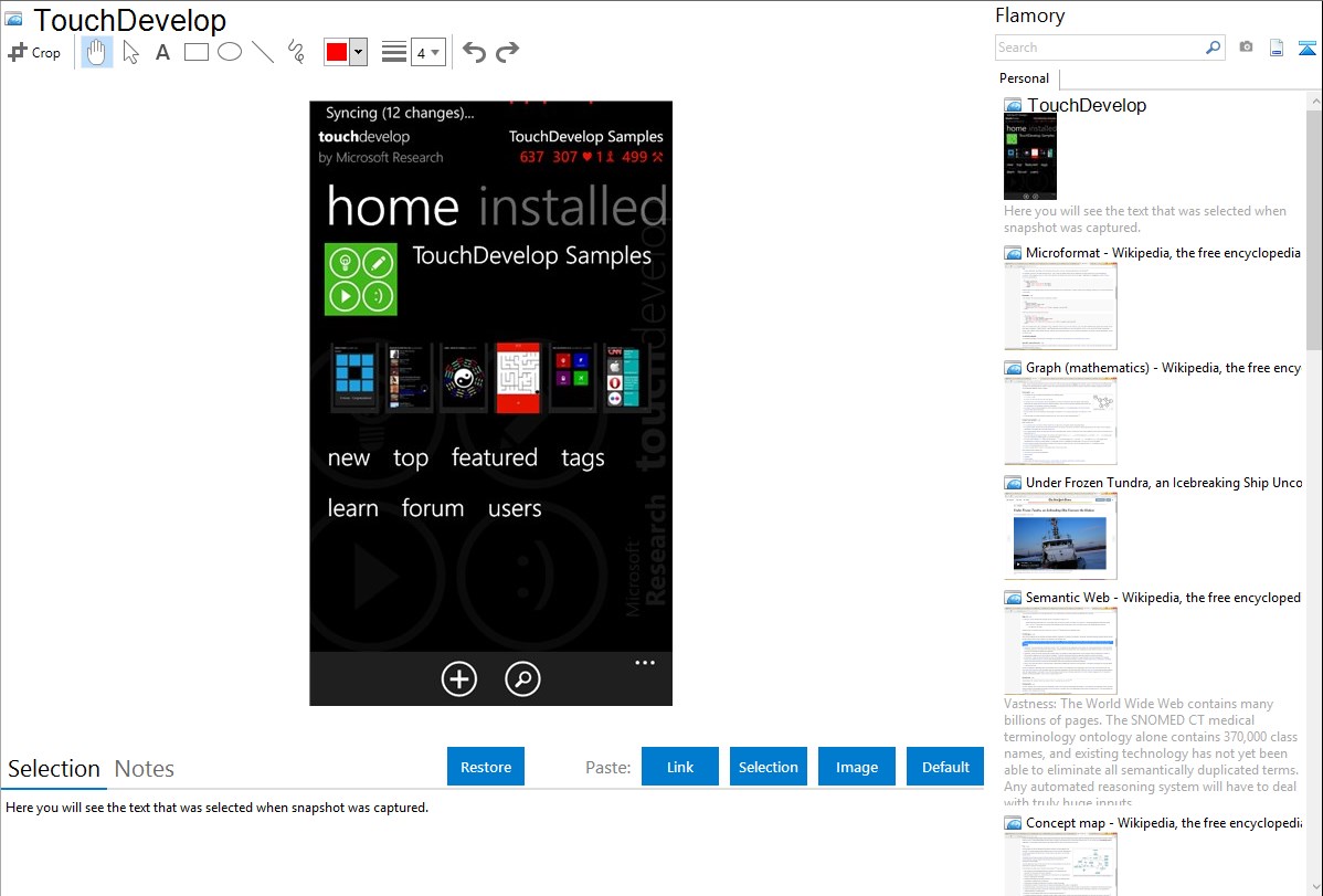 Flamory helps you capture and store screenshots from TouchDevelop by pressing a single hotkey. It will be saved to a history, so you can continue doing your tasks without interruptions. Later, you can edit the screenshot: crop, resize, add labels and highlights. After that, you can paste the screenshot into any other document or e-mail message.