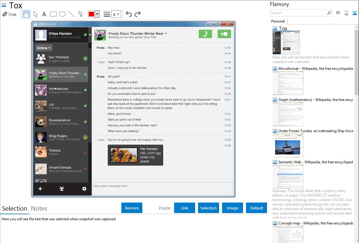 Flamory helps you capture and store screenshots from Tox by pressing a single hotkey. It will be saved to a history, so you can continue doing your tasks without interruptions. Later, you can edit the screenshot: crop, resize, add labels and highlights. After that, you can paste the screenshot into any other document or e-mail message.