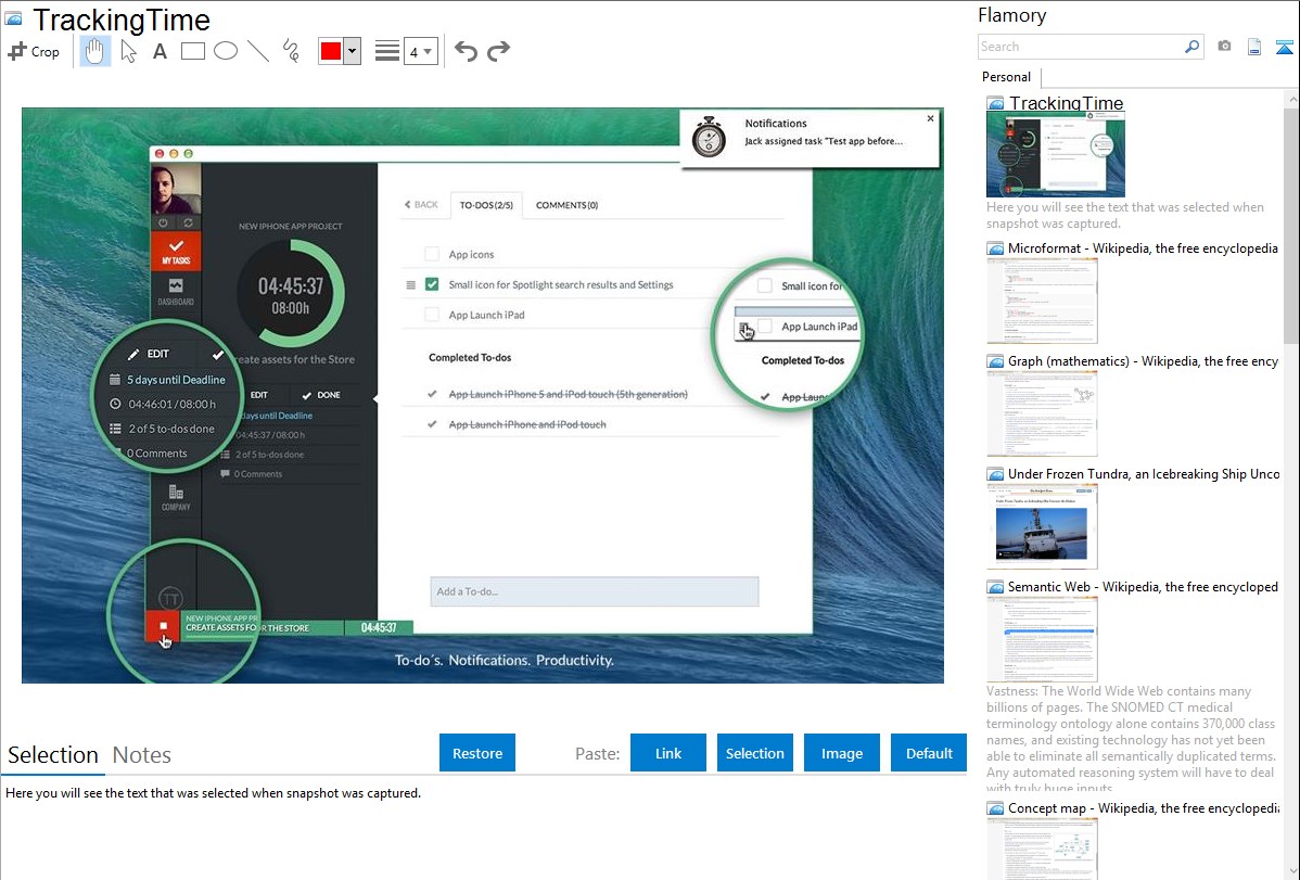 Flamory helps you capture and store screenshots from TrackingTime by pressing a single hotkey. It will be saved to a history, so you can continue doing your tasks without interruptions. Later, you can edit the screenshot: crop, resize, add labels and highlights. After that, you can paste the screenshot into any other document or e-mail message.