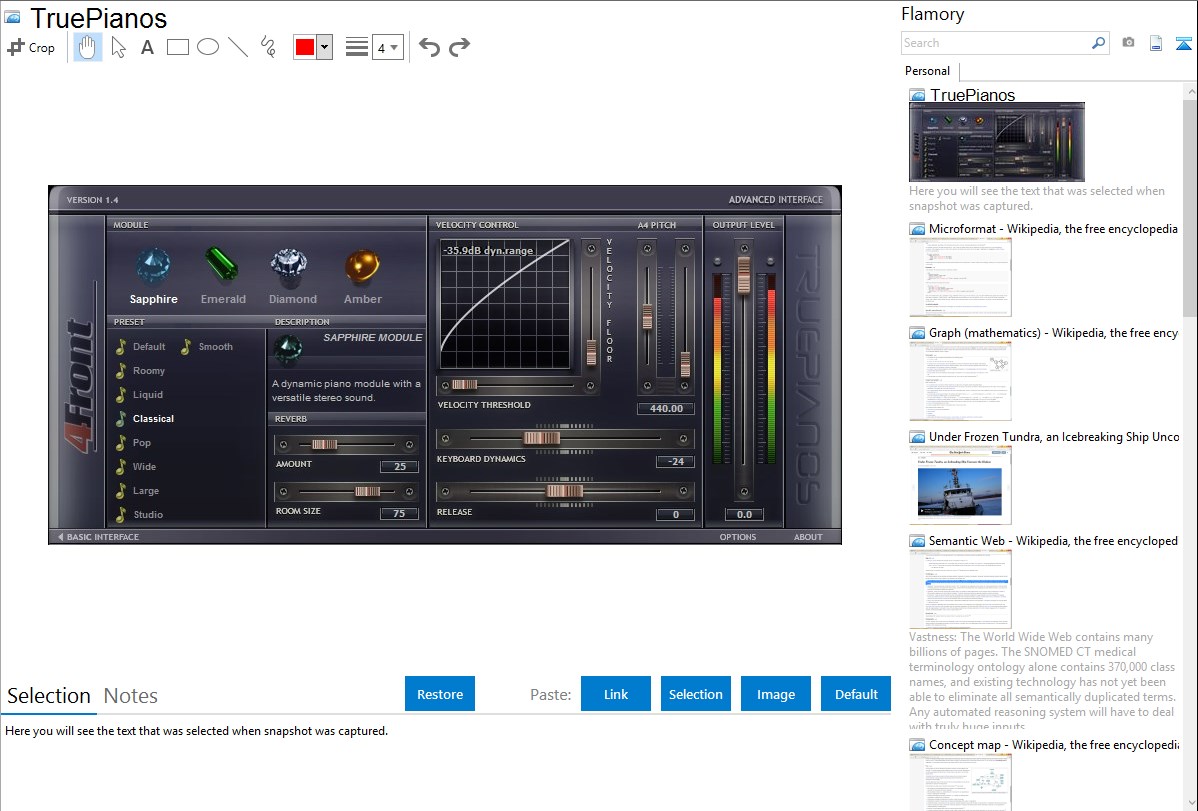 Flamory helps you capture and store screenshots from TruePianos by pressing a single hotkey. It will be saved to a history, so you can continue doing your tasks without interruptions. Later, you can edit the screenshot: crop, resize, add labels and highlights. After that, you can paste the screenshot into any other document or e-mail message.