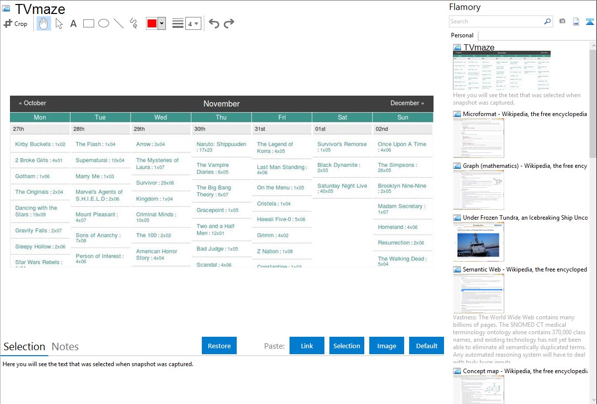 Flamory helps you capture and store screenshots from TVmaze by pressing a single hotkey. It will be saved to a history, so you can continue doing your tasks without interruptions. Later, you can edit the screenshot: crop, resize, add labels and highlights. After that, you can paste the screenshot into any other document or e-mail message.