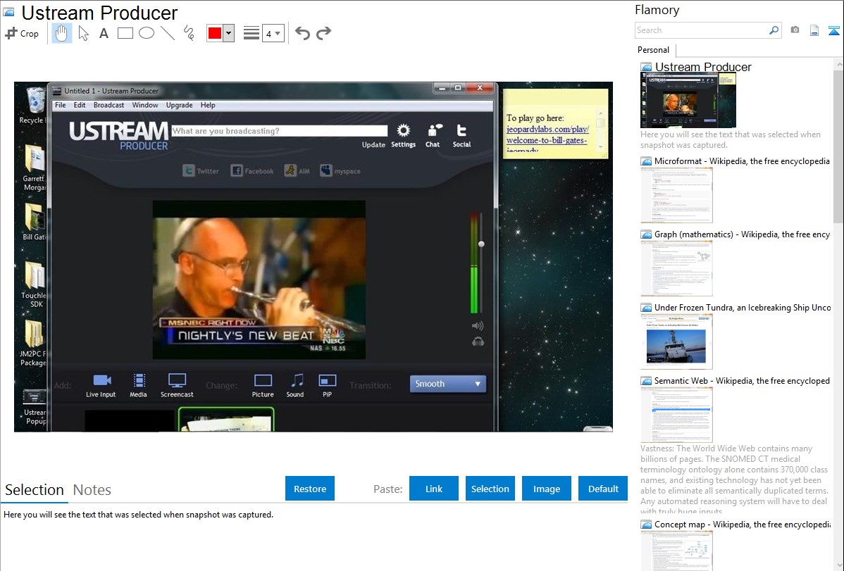 Flamory helps you capture and store screenshots from Ustream Producer by pressing a single hotkey. It will be saved to a history, so you can continue doing your tasks without interruptions. Later, you can edit the screenshot: crop, resize, add labels and highlights. After that, you can paste the screenshot into any other document or e-mail message.